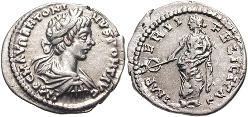SEV-386   CARACALLA. 198-217 AD. AR Denarius (3.55 gm). Laodicea mint. Struck 198 AD. IMP C M AVR ANTON-INVS PONT AVG, laureate, draped and cuirassed bust right, seen from behind / IMP-ERII FELICITA, Felicitas standing left, holding caduceus in right hand, child in left arm. RIC IV 331var.; BMCRE 646A var.; RSC 94 var. Ex CNG Auction 43, lot 2127.