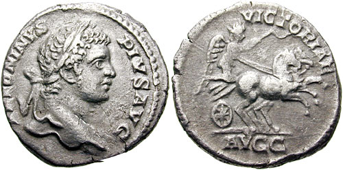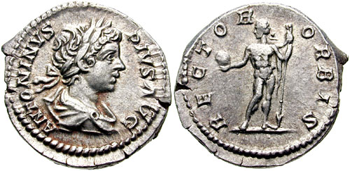 head right / PONTIF TR P X COS II, Caracalla standing facing, head right,