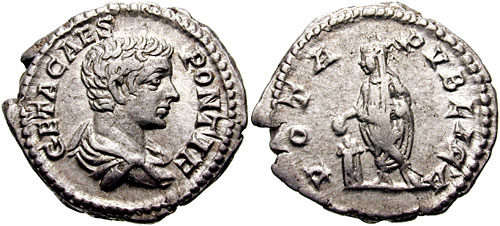 right, holding long caduceus, clasping hands with Geta standing left, holding