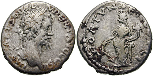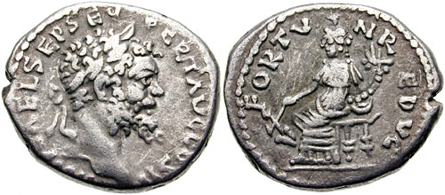 SEV-256   SEPTIMIUS SEVERUS. 193-211 AD. AR Denarius (3.09 gm). Emesa mint. Struck 194 AD. IMP CAE L SEP SE-V PERT AVG COS II, laureate head right / FORTVNA R-EDVCI, Fortuna seated left, holding rudder in right hand, cornucopiae in left. RIC IV 381; BMCRE 354 note; RSC 185a.