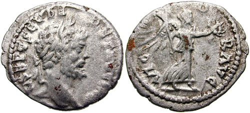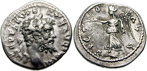 SEPT SEV P-ERET AVG IMP [II], laureate head right / VICTO-R AVG, Victory walking