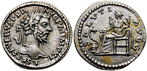 SEV-157   SEPTIMIUS SEVERUS. 193-211 AD. AR Denarius (3.55 gm). Laodicea mint. Struck 198 AD. L SEP SEVERVS PER AVG P M IMP XI, laureate head right / SALVTI AVGG, Salus seated right, feeding serpent coiled around altar. RIC IV 497a; BMCRE 629; RSC 642. Ex Kelly Collection (Spink Auction 123, 18 November 1997), lot 1146.