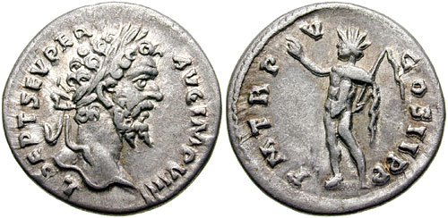 SEV-151   SEPTIMIUS SEVERUS. 193-211 AD. AR Denarius (3.22 gm). Laodicea mint. Struck 197 AD. L SEPT SEV PER AVG IMP VIIII, laureate head right / P M TR P V COS II P P, Sol standing left, raising right hand, holding whip in left. RIC IV 492; BMCRE 463 (same reverse die); RSC 433. Toned, nice