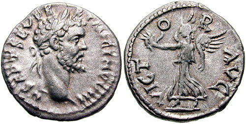 SEV-155   SEPTIMIUS SEVERUS. 193-211 AD. AR Denarius (2.90 gm). Laodicea mint. Struck 198 AD. L SEP SEVERVS PER AVG PIV IMP XI PAR P M, laureate head right / AR AD TR P VI COS II P P, Victory walking left, holding wreath in right hand, palm in left. RIC IV 494A var.; BMCRE pg. 280 var.; RSC 52a var.