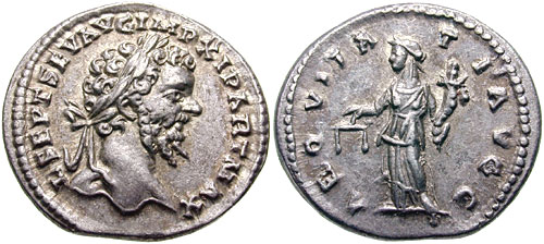 SEP SEVERVS PER AVG P M IMP XI, laureate head right / SALVTI AVGG, Salus seated
