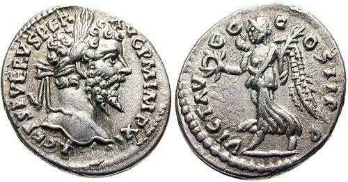 SEVERVS AVG PART MAX P M TR P VIIII, laureate head right / COS II P P, Victory