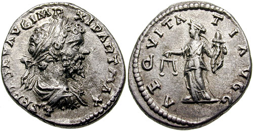 SEPT SEV AVG IMP XI PART MAX, laureate head right / AEQVITA-TI AVGG, Aequitas